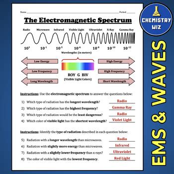 Chemistry worksheets can range from simple diagrams and diagrams of the electromagnetic spectrum to more complex equations and diagrams. Some worksheets include diagrams of the different types of energy waves and how they interact with matter, while others focus on understanding the different elements that make up the spectrum. Other worksheets focus on the different types of energy and how they can be used to measure different things. For example, a worksheet might focus on how to measure the frequency of a certain type of energy, or how to measure the intensity of a light source.
